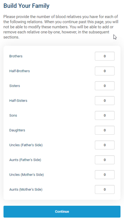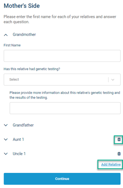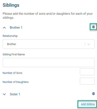 The Build Your Family page, where the patient enters the number of siblings, children, aunts and uncles they have, is used to build the pedigree and can only be edited once. After the patient has passed this page, they cannot go back to edit those numbers. At that time, if they need to delete a relative, they can do so using the trash icon on the siblings and aunts/uncles pages or on the Describe your family pages. To add a relative, they can use the Add Sibling/Add Aunt/Uncle buttons on those pages or the Add Relative button on the Describe your family pages (see screenshots below).