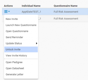 Most questionnaires are set to lock once the patient completes and submits them. If a patient tries to return to the questionnaire after submission, they will receive a ‘Locked Questionnaire’ message, indicating they cannot make any further updates to the data. If you are contacted by a patient and would like to allow them access to their questionnaire to make updates, you can do so manually. Open the Invite Status module and find the patient’s invite. In the Actions menu, select Unlock Invite. This will allow them to access the questionnaire until they again submit it, at which time it will lock again.