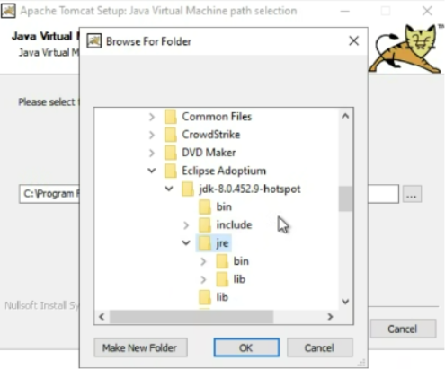 1. The Java Virtual Machine page should automatically redirect to the Java folder if it was installed prior to the Tomcat install.