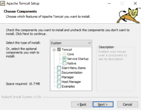 1. Click through the Apache Tomcat Setup Welcome and Licensing pages. On the Choose Components page, click the + (expansion button) next to the Tomcat item to reveal more options. Check the Service Startup option. Click Next to continue.
