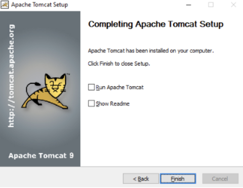 1. When the installation process has completed, deselect the Run Apache Tomcat and Show Readme checkboxes and click Finish: