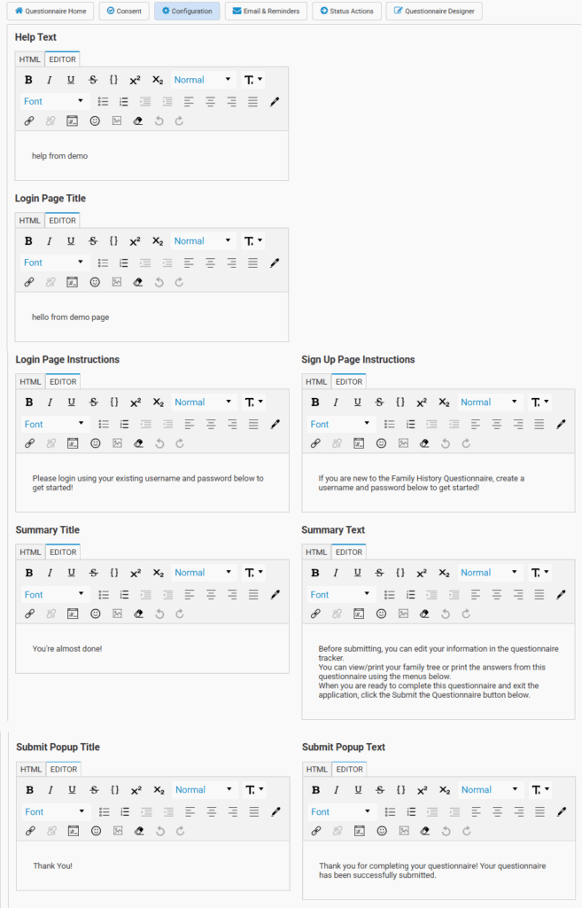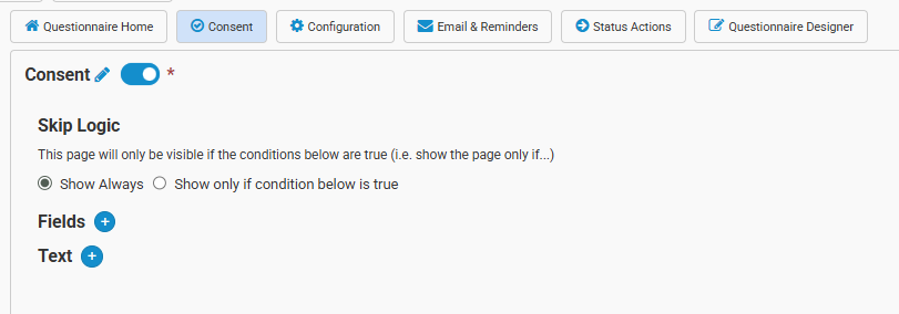 Consent Configuration: The consent section can be toggled on or off for each questionnaire