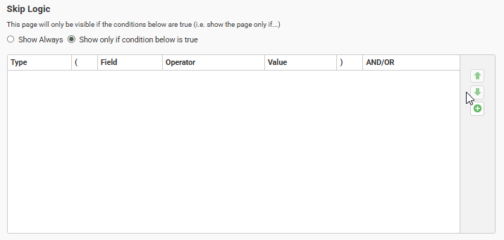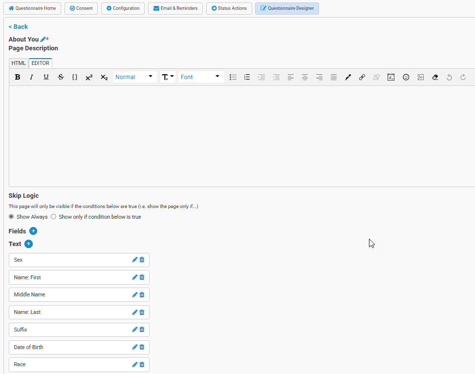 - Skip Logic: Configures whether the page always shows or whether it only shows if a specific condition is met, such as only displaying a page if the patient is female or has answered yes to having cancer