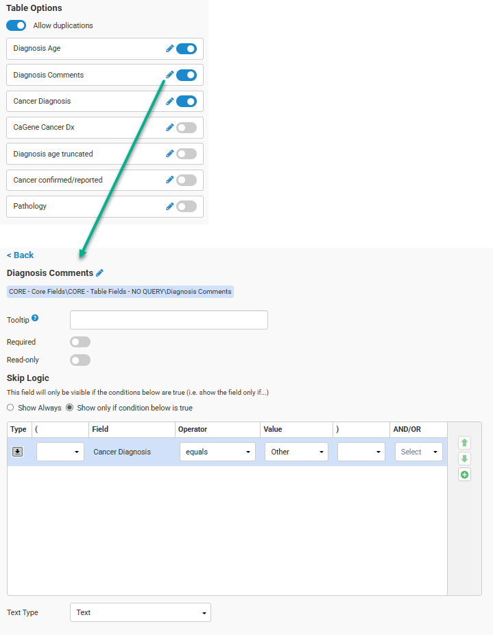 - Able to setup skip logic WITHIN the table sub-fields (for example: only displaying the ‘Diagnosis Comments’ field when Cancer Diagnosis = Other)