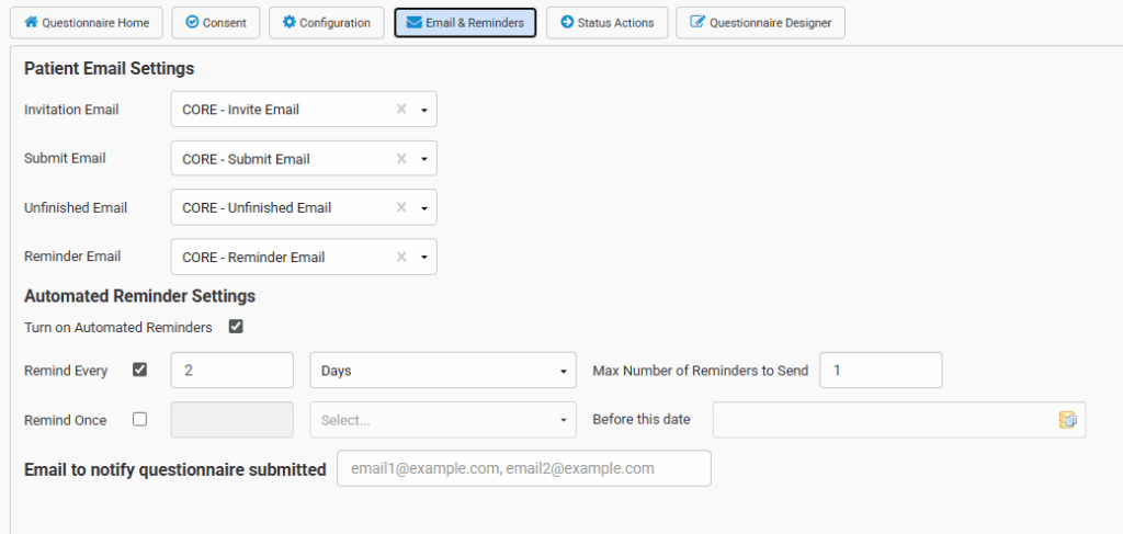 Turn on Automated Reminders: Turns on the automated reminder functionality, the following configurations are required for this to actually function. Can use one or both of the following reminder options. It is required that the ‘Incomplete Questionnaires’ status action to be configured prior to configuring automated reminders.