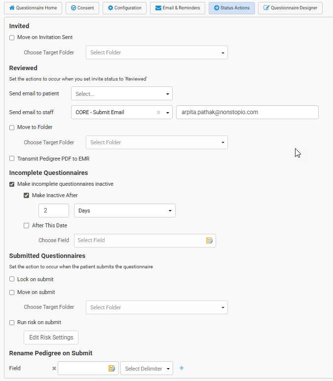 Send email to staff (upon setting status to reviewed): To map the email template from ‘Email Templates’ to which should be sent to the email address(s) designated here upon the clinician manually changing the invite status to ‘Reviewed’