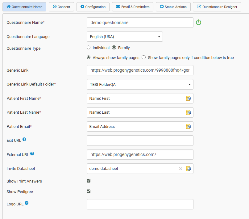 Generic Link: System generated link in which is a direct link to the questionnaire (not associated with an invite for a specific individual in the questionnaire). Upon creating credentials using the generic link, a new pedigree will be created.