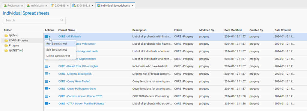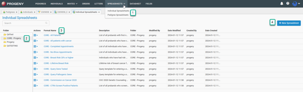 - The New Spreadsheet button allows you to build a new Individual or Pedigree Spreadsheet, depending on which Spreadsheet module was chosen. Once you build a spreadsheet you can save it as a format, then re-run and edit as needed.