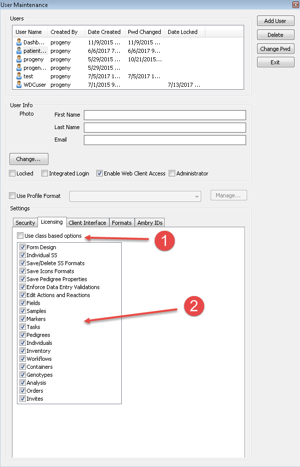 - Locked: Enabling this option will lock the selected user’s account and prevent them from having any access to the Progeny database.
