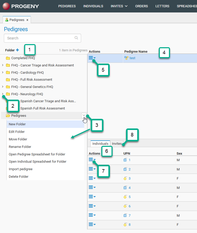 - Pedigrees Actions menu: Menu options for working with pedigrees.