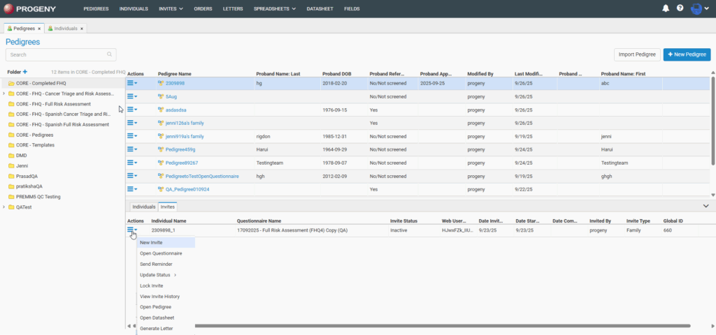 - The Invites tab shows all the invites to individuals in the selected pedigree and has the same invite options as the Invites Module.