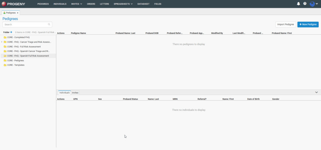 - The Folder section: Lists the folders used for organizing and storing pedigrees.
