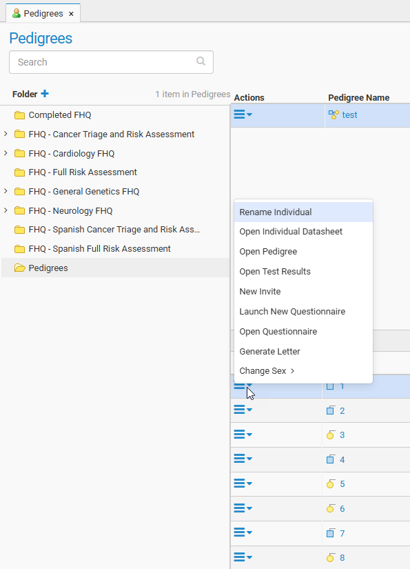 - Open Pedigree – opens the pedigree canvas for that pedigree